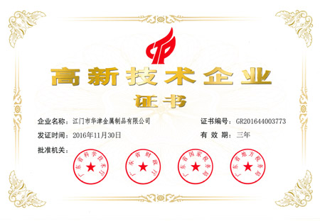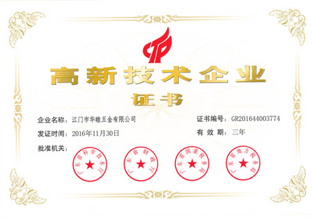 2016年11月30日,本公司之公司江門華津金屬制品有限公司(以下簡稱“華津”)及江門市華睦五金有限公司(以下簡稱“華睦”)分別收到由廣東省科學技術廳、廣東省財政廳、廣東省國家稅務局及廣東省地方稅務局共同批準的《高新技術企業(yè)證書》(證書編號分別為:GR201644003773號及GR201644003774號)。