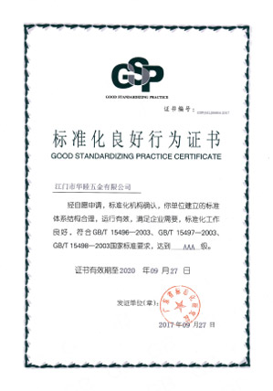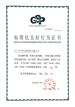 2017年9月27日,本公司之公司江門華津金屬制品有限公司(以下簡稱“華津”)及江門市華睦五金有限公司(以下簡稱“華睦”)收到由廣東省標準化研究院所頒發(fā)的《標準化良好行為證書》(證書編號分別為:GSP(44L)00603-2017 號及GSP(44L)00604-2017號)。